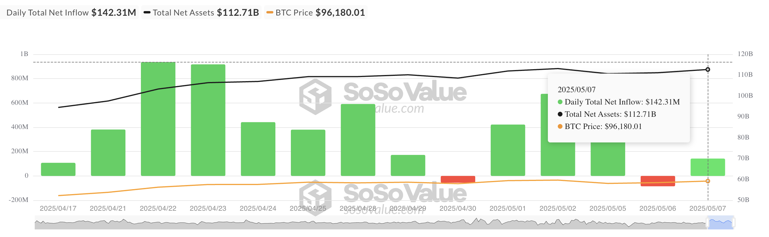 However, the trend shifted on Wednesday, thanks to the Fed’s decision to hold interest rates. The announcement triggered a sharp rebound in investor confidence, fueling fresh inflows of $142.31 million into BTC ETFs.