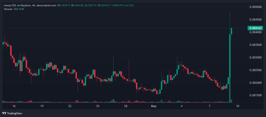 Post-announcement, meme coins linked to political figures experienced a surge in their market value. These include Doland Tremp (TREMP) and Jeo Boden (BODEN). TREMP notably rose from 0.0017 Solana (SOL) to 0.0047 SOL (approximately from $0.24 to $0.67) before settling at 0.0041 SOL (~$0.59).