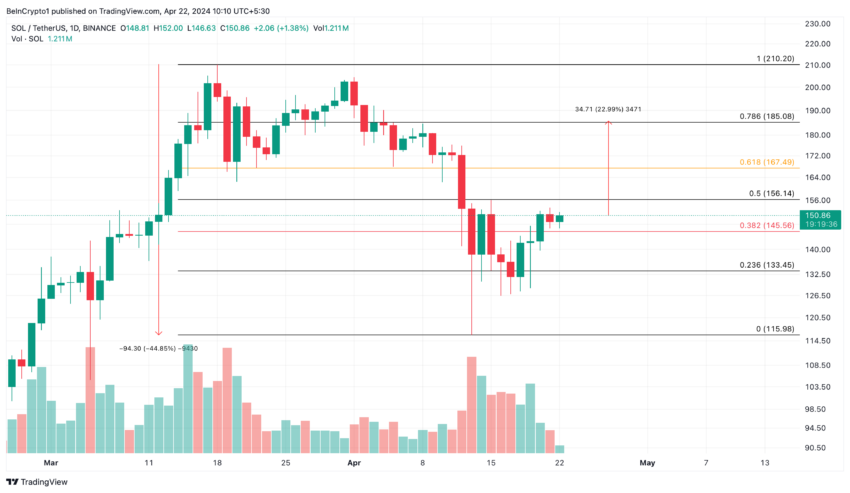 Currently, Solana’s price trajectory is on a possible upturn. After reaching a high of $210 on March 18, the Solana price dropped significantly by over 44%, hitting a low of around $116 on April 13. Nevertheless, it has rebounded, trading nearly 30% higher from that low.