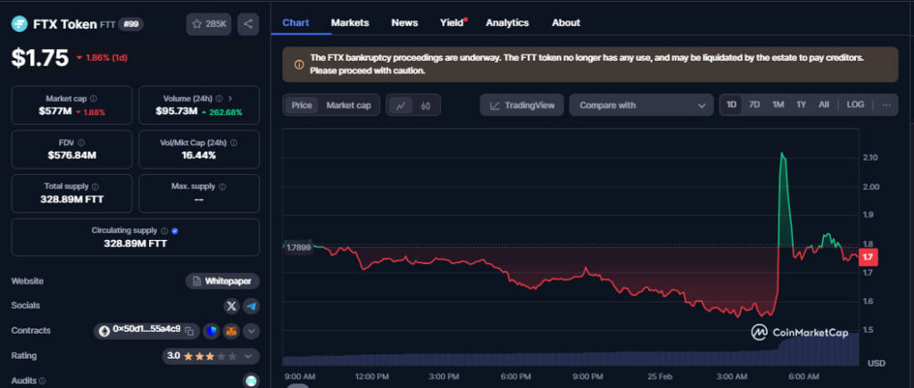 The native coin trades at $1.75, displaying significant volatility amid SBF-driven recoveries.