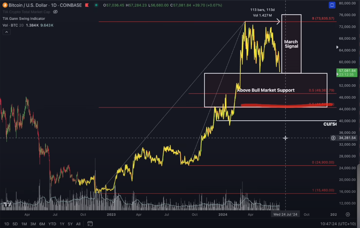 According to Pizzino, Bitcoin could still resume an uptrend if it manages to stay above the bull market support level. He shares a chart suggesting that BTC may move back above $60,000 by November of this year.