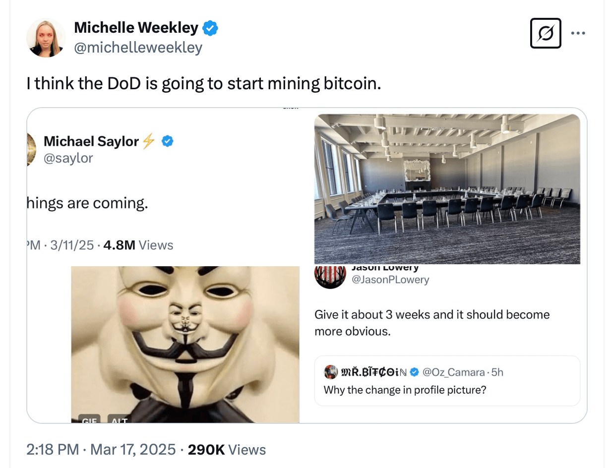 Among the disseminated materials was a repost from Michael Saylor, founder of Strategy, featuring his cryptic declaration: “Big things are coming.” Weekley further amplified intrigue by circulating a snapshot from Matthew Pines, Bitcoin Policy Institute’s Executive Director, depicting a nondescript conference space captioned, “The room where it happened.”
