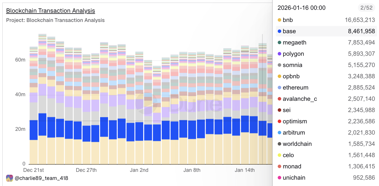 Base itself is reinforcing this signal. Beyond B3’s dominance in per-wallet activity, Base has also ranked near the top in total daily transactions over the same period, indicating that gaming activity is feeding into broader network usage.