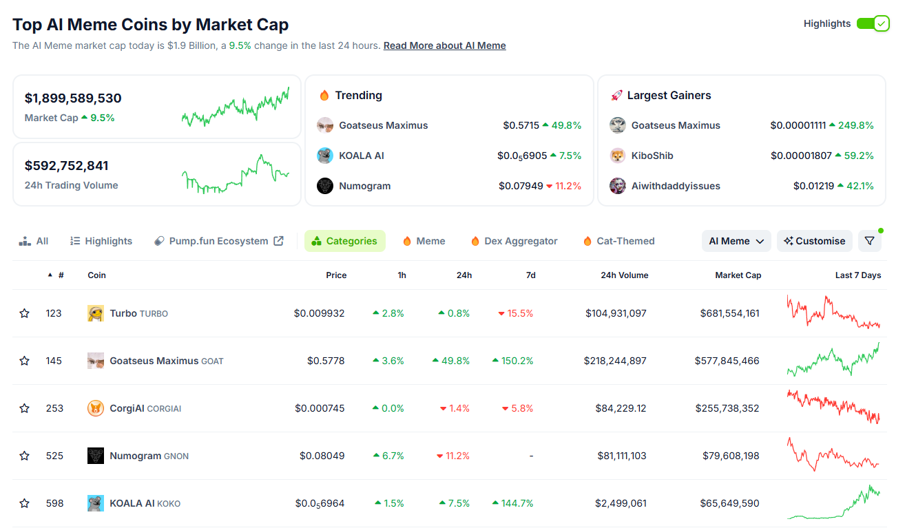 According to CoinGecko data, the market capitalization of AI meme coins surged to nearly $1.9 billion, increasing by 9.5% on October 23. Additionally, daily trading volume exceeded $590 million.