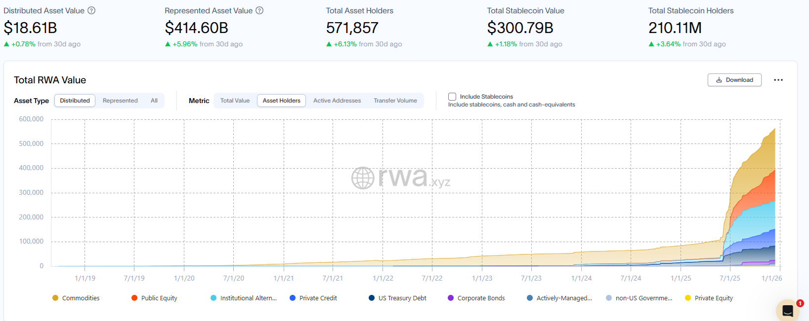 The whole of 2025 showed rapidly expanding ownership of various tokenized asset classes. Wallet owners expanded to over 571K, still a fraction of legacy stablecoin holders. However, tokenization is proving to be a lasting trend with growing infrastructure.