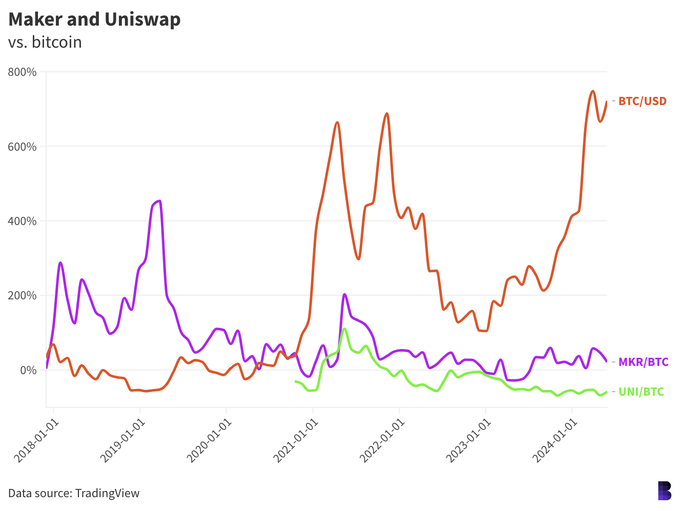 While MKR’s price against bitcoin multiplied between 2018 and 2019, it hasn’t stuck the landing. UNI otherwise charted a similar path: Its bitcoin ratio doubled in its first year before slowly draining out, and it is now 60% below where it was after its massive 2020 airdrop.