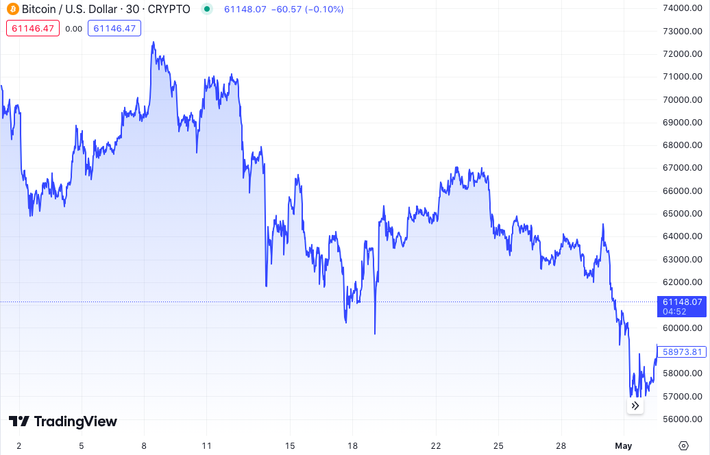 While widely anticipated, Bitcoin’s fourth halving on April 20 followed the historical trend of short-term volatility. Bitcoin fell nearly 21% in April alone, dropping below $60,000 on April 19 as investors cashed out of a robust rally that had previously pushed prices above $72,500 (on April 8). Between April 30 and May 1, the Bitcoin price crashed below $57,000, its lowest level since late February.