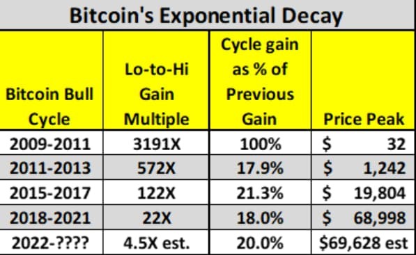Brandt’s detailed analysis examines the diminishing momentum seen across Bitcoin’s previous bull cycles. According to Brandt, each cycle since Bitcoin’s inception has experienced a sharp decrease in exponential growth, culminating in what he describes as ‘Exponential Decay’.