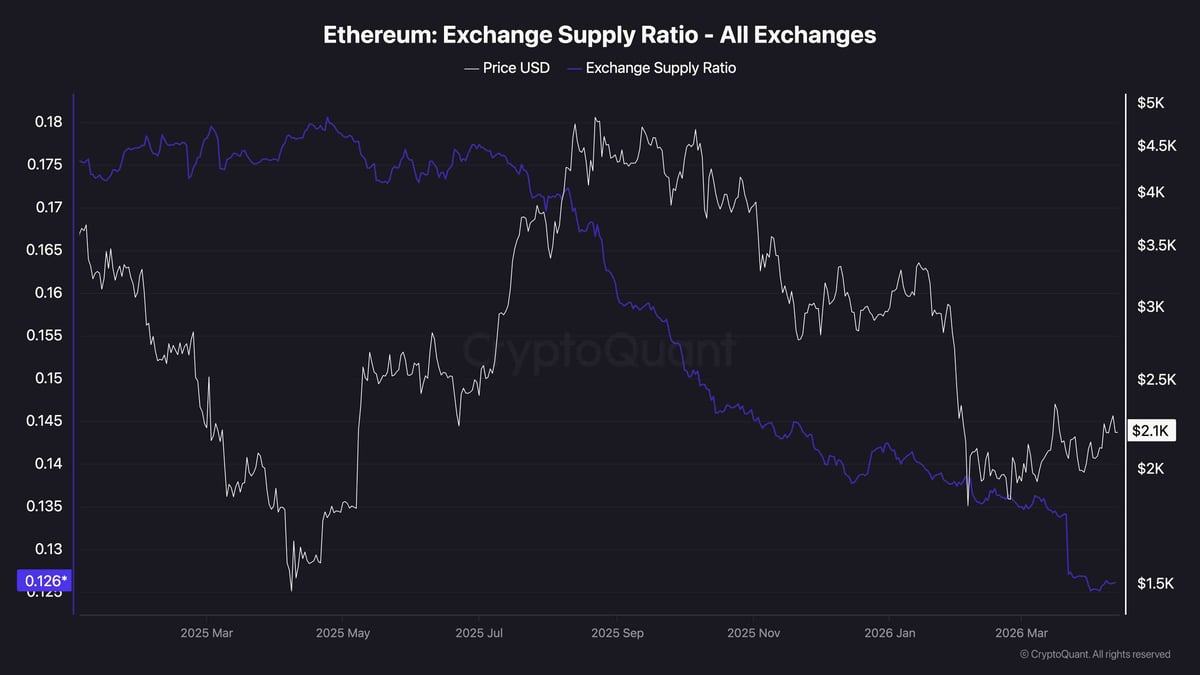 What makes the current reading particularly notable is the growing divergence between supply availability and price. $ETH is trading near $2.1k–$2.2k while exchange-held supply is at levels not seen in the entire dataset. This means that there is structurally less $ETH available to sell on exchanges. In previous cycles, sustained declines in the exchange supply ratio have happened before price recoveries once demand returned.