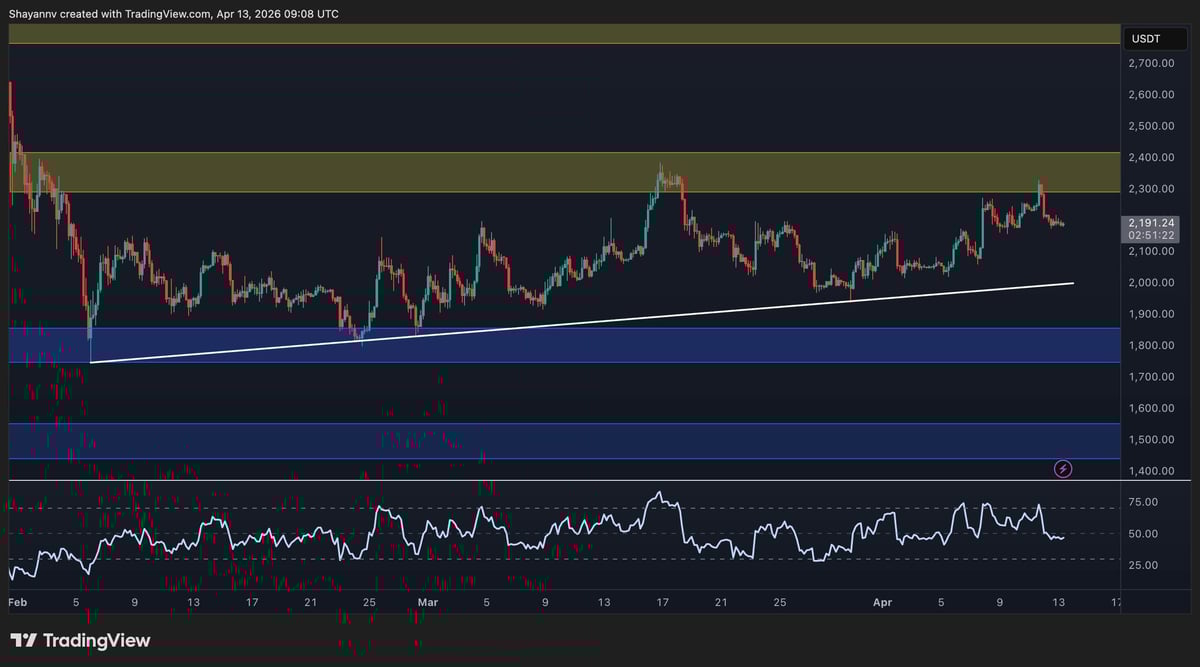 A clean breakout above $2.4k on this timeframe, ideally accompanied by RSI holding above 60, would be the most constructive short-term development $ETH has seen in months. But failure to do so keeps the range-bound structure intact and brings the ascending trendline near $2k back into focus as the next test.