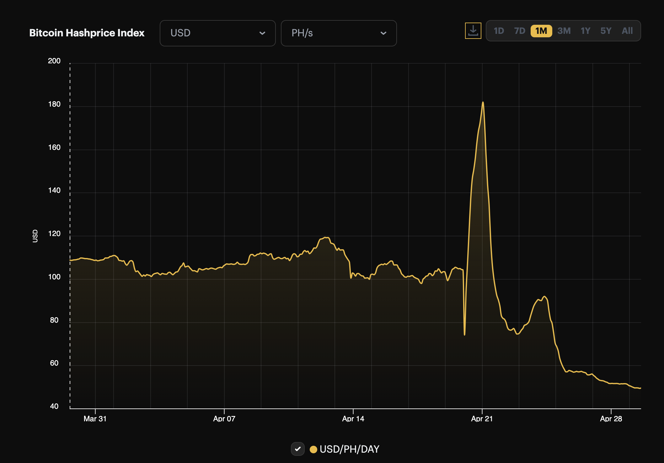 As Bitcoin underwent its fourth halving event on April 20, expectations were high regarding a potential increase in miner revenue. However, contrary to these expectations, the hash price witnessed a steep decline, currently valued at less than $50 per PH/s per day.