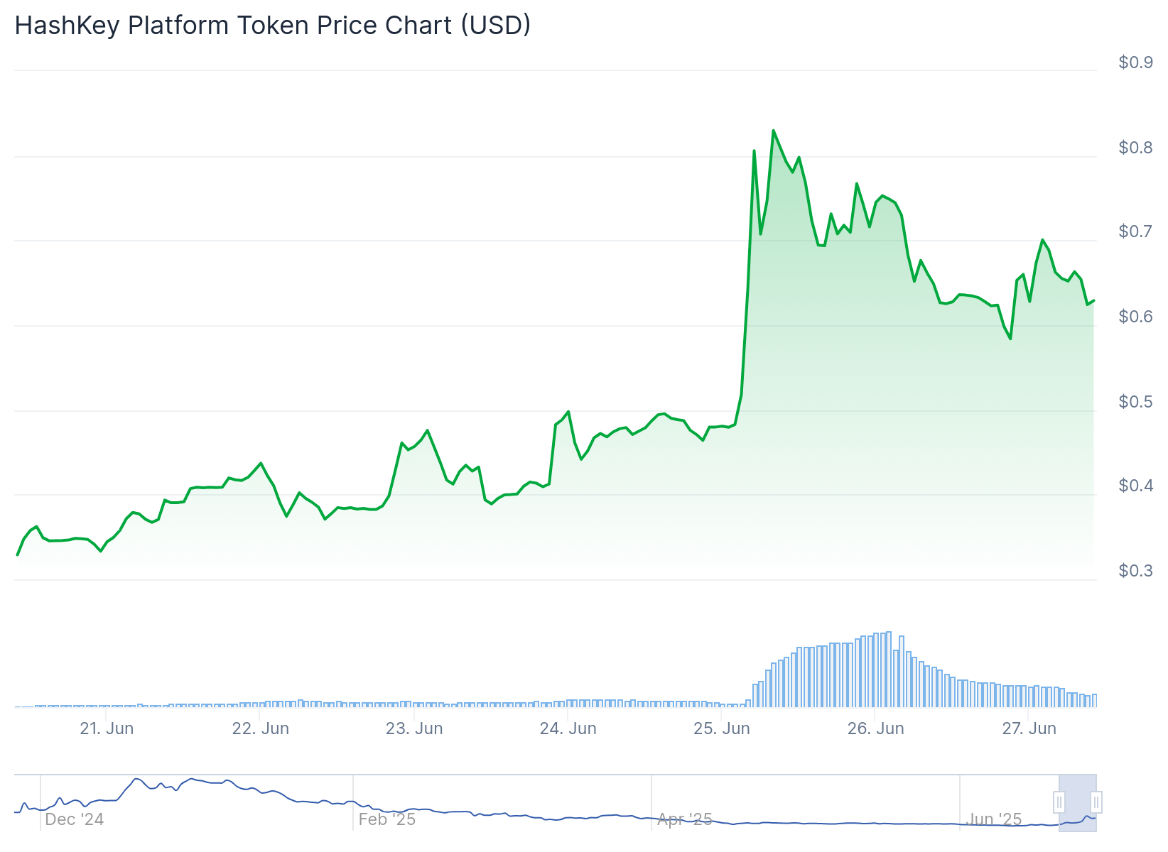 Following the Guotai Junan licensing news, between June 24 and June 25, HashKey’s HSK token jumped 80%, reaching $0.83, a price level last seen in March. The token — launched on the Ethereum network and used to pay for fees on HashKey’s trading platform — is currently up about 90% on the week, trading near $0.62 at press time.