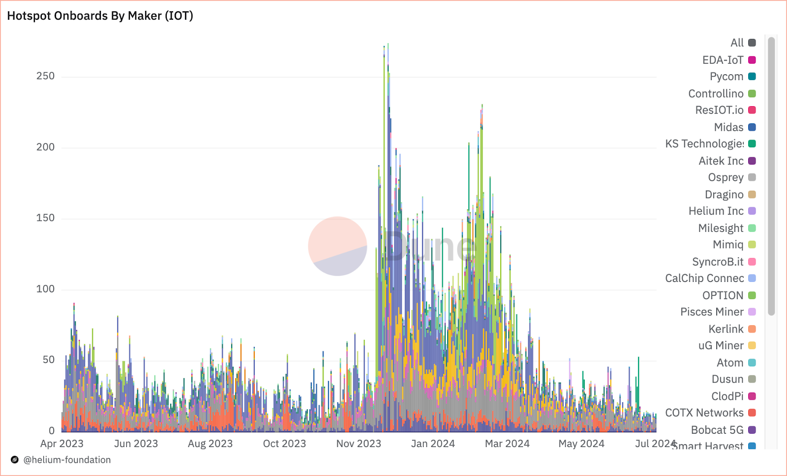 As this Helium Foundation Dune dashboard shows, however, those onboarding numbers have been slowing — from over a hundred per day between roughly December through March to scarcely more than a dozen daily onboards over the past couple weeks.