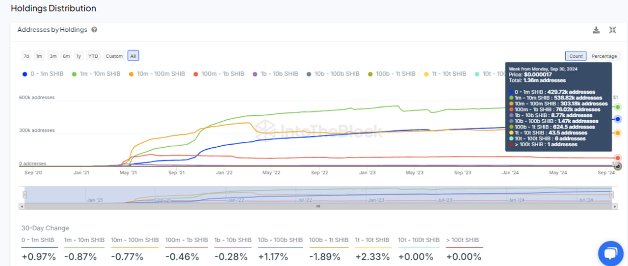While the number of addresses in the 100 billion to 1 trillion SHIB range remains substantial, there has been a small decrease in the number of holders. The 624,500 addresses in this category reflect a 1.89% reduction over the past 30 days.
