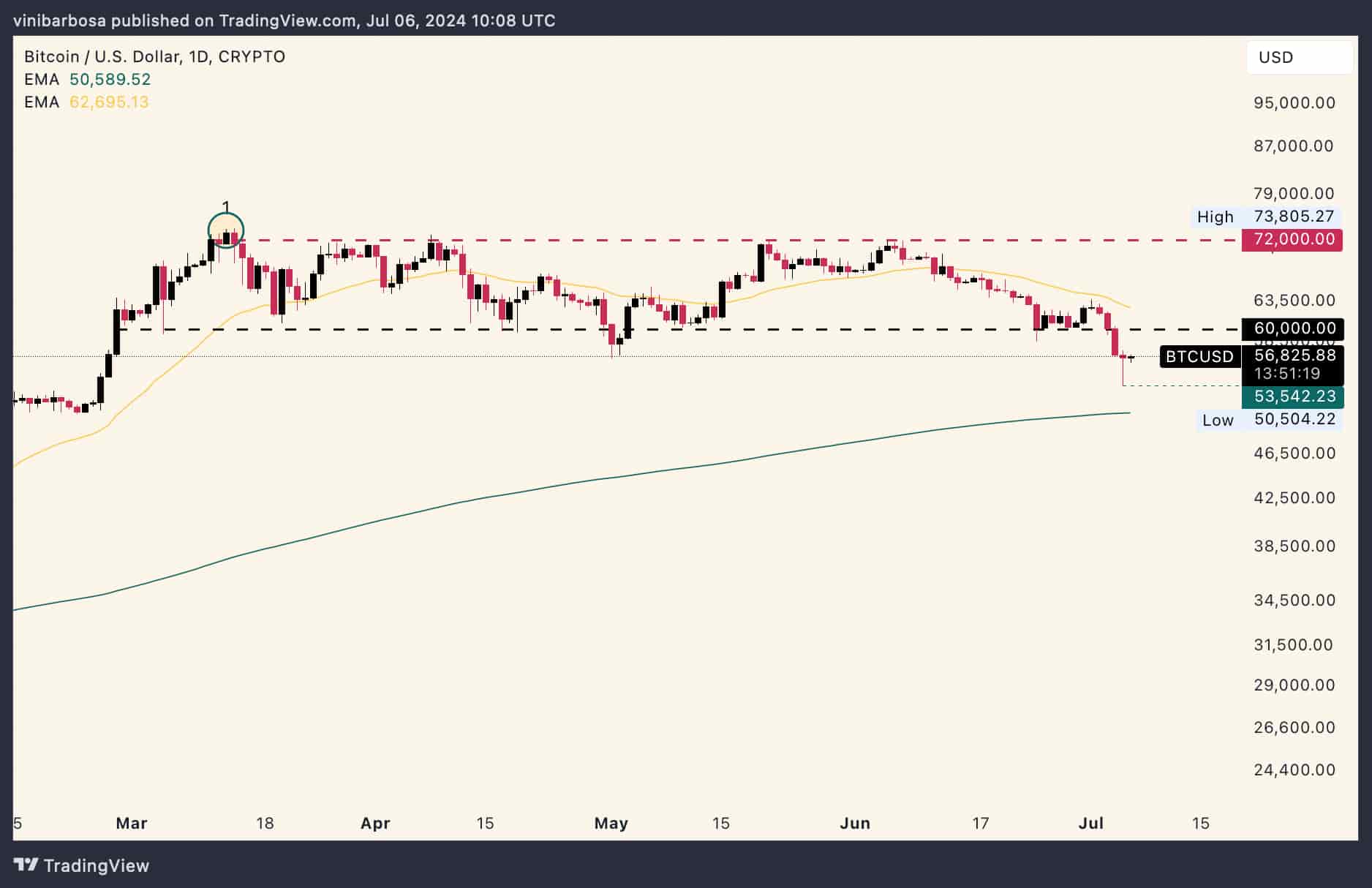 As of this writing, BTC trades at $56,825, halfway between $50,000 and $60,000, two key psychological levels.