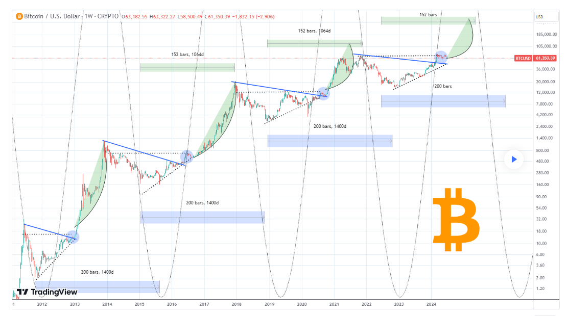 The cycle bottom-to-bottom time range has been relatively consistent at around 1400 days, while the bottom-to-top of the last two cycles was approximately 1064 days. This consistent pattern suggests that Bitcoin is primed for another substantial rise.