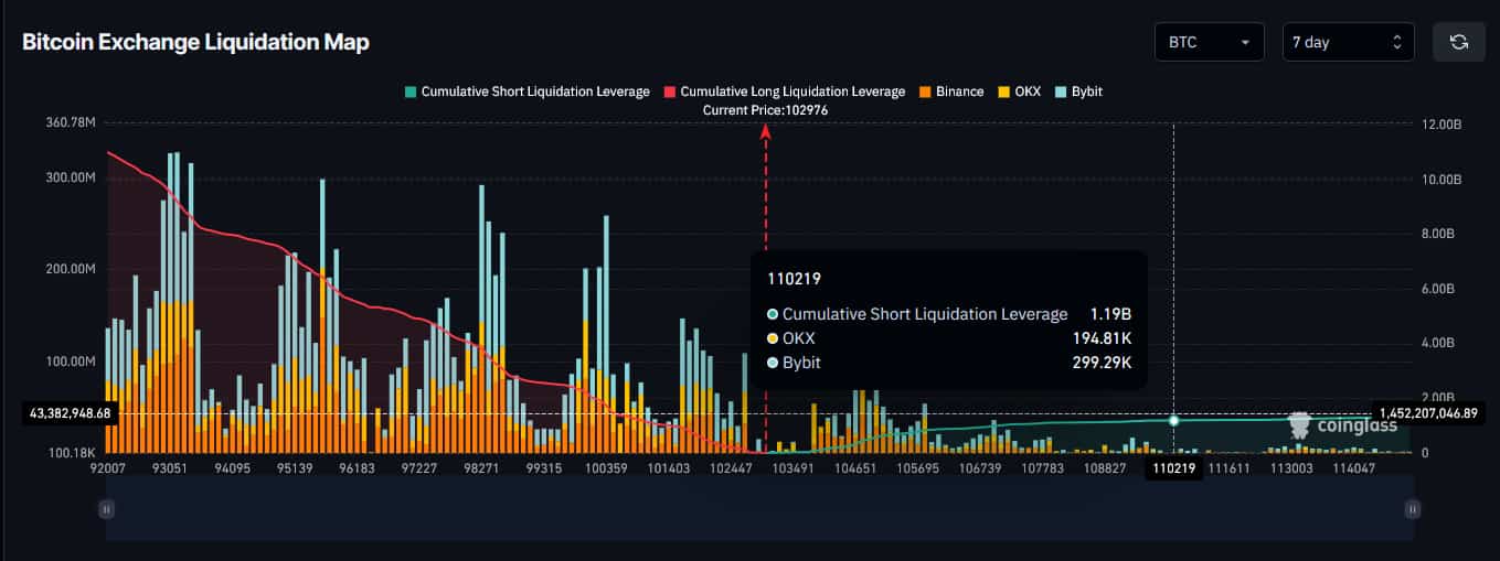 To be more exact, short sellers stand to lose roughly $1.19 billion should the price of Bitcoin reach levels above $110,000, per data retrieved by Finbold on May 9 from cryptocurrency market analysis platform CoinGlass.