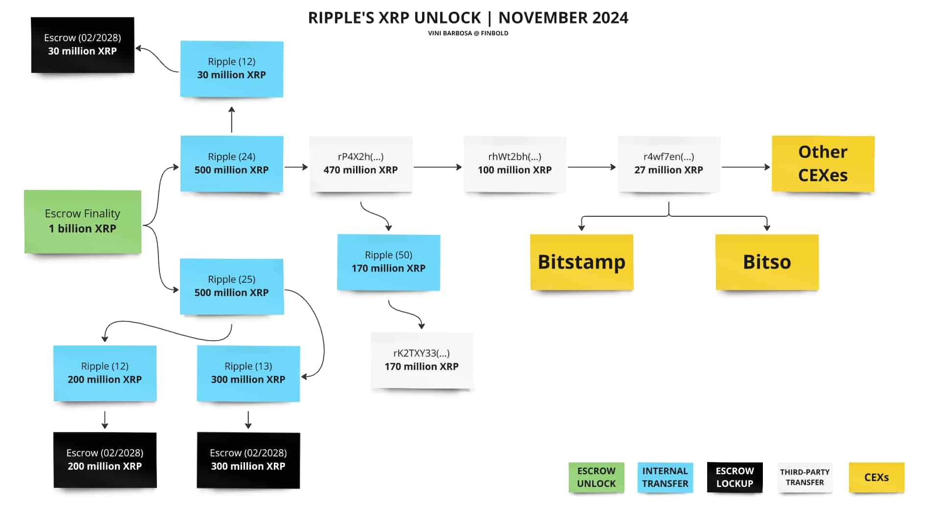 After unlocking the escrow from Ripple (24) and Ripple (25), the company relocked 530 million XRP into escrows for February 2028 in the accounts Ripple (12) and Ripple (13), reserving the 470 million XRP into Ripple (1).