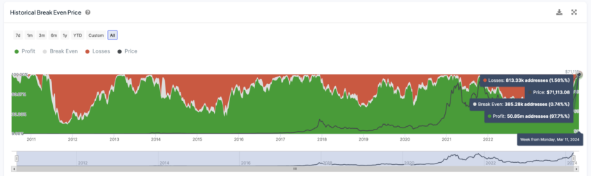 Due to BTC’s recent surge, consistently setting new all-time highs, the proportion of holders enjoying profits has approached nearly 100%. This level of widespread profitability among BTC investors has not been observed since November 2021, when the metric soared to 93.8%.