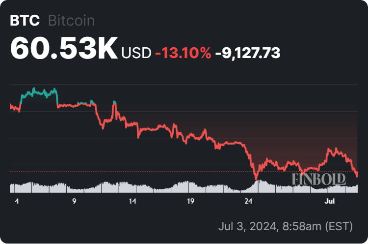 Indeed, the flagship decentralized finance (DeFi) asset was at press time changing hands at the price of $60,530, which suggests it has declined 3.35% in the last 24 hours, adding up to the weekly loss of 2.30%, and accumulating a dip of 13.10% on its monthly chart, as per the most recent data on July 3.