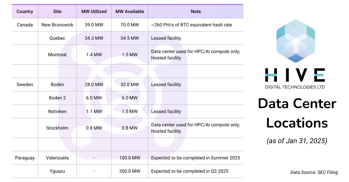 - HPC & AI Computing: HIVE was among the first public miners to pivot to HPC, leveraging its GPU-based Ethereum mining expertise. As early as 2023, the company reported $1.61 million in revenue from HPC hosting. Today, Hive continues to utilize its existing data centers in Montreal (Canada) and Stockholm (Sweden) for HPC services. Additionally, the company plans to offer GPU server rentals through marketplace aggregators and explore a new cloud service offering.