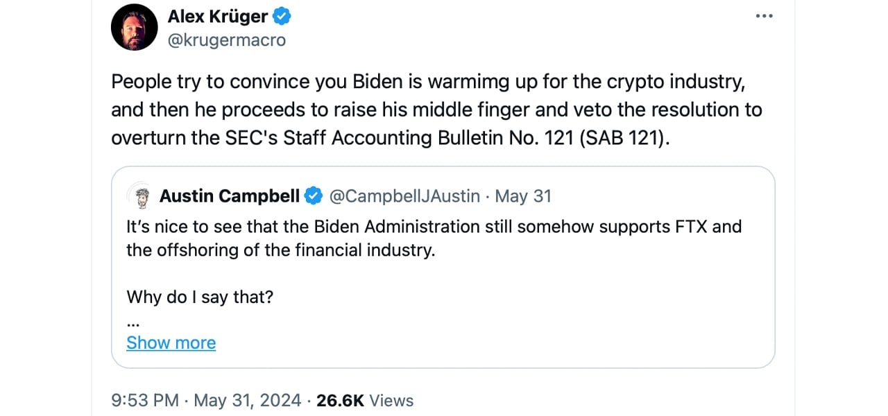 “Veto of SAB 121 by Biden shows that there is no real effort in the democratic party to work with crypto,” crypto enthusiast Eric.eth wrote on X. “The ETH ETF was approved because the SEC had no grounds to reject it, period. The Democrats’ war of crypto is more full force than it ever has been before.”