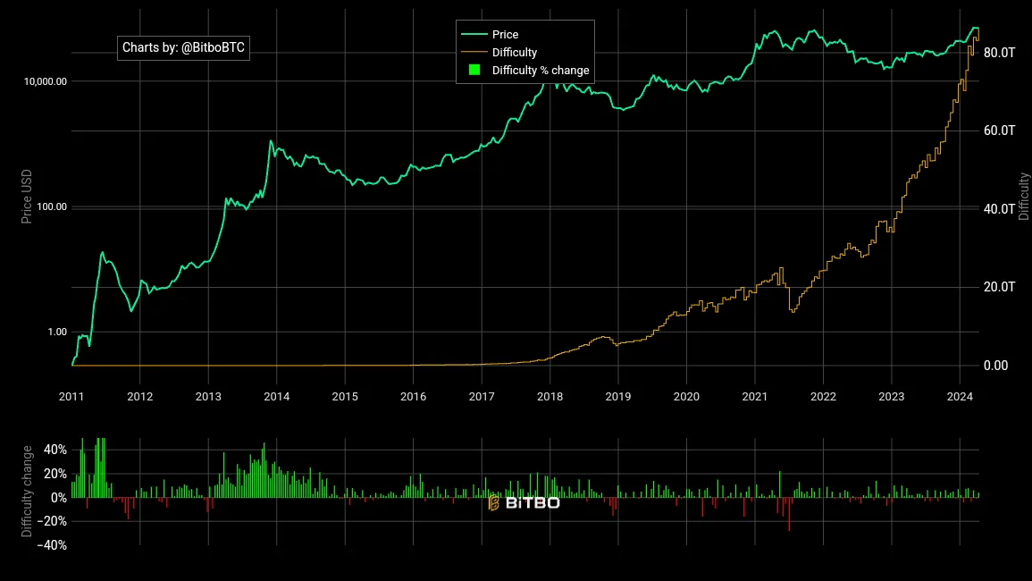 Historically, Bitcoin mining difficulty jumps with BTC price bumps. Image credit: Bitbo