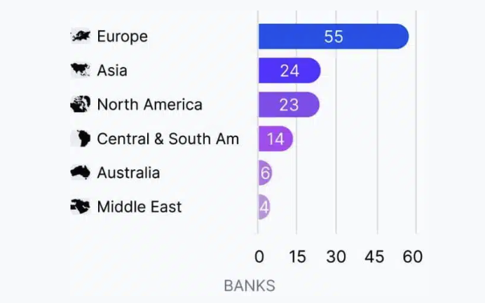 A study by Coincub indicates that up to 55 banks in Europe have integrated cryptocurrency-related services. Germany recorded six banks, while the UK has 5. Countries like Switzerland, Liechtenstein, and Lithuania also boast pioneering banks in this space.