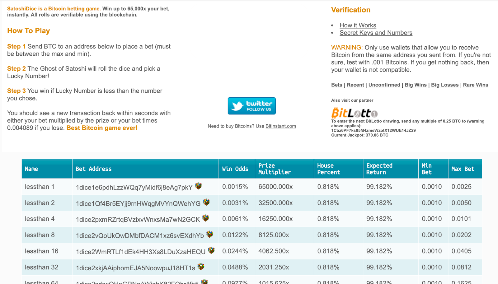 Players would directly send bitcoin to one of many “1dice” vanity addresses, each with their own special properties designated by the platform.