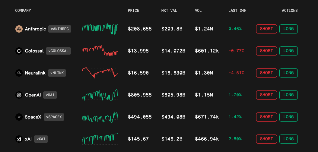 Ventuals sets itself apart by focusing specifically on private equity and pre-IPO companies, including OpenAI, SpaceX, and Kraken. Some of the most popular markets by testnet volume include Kraken, Neuralink, and Polymarket.