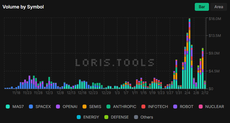 The most actively traded product so far is MAG7 — a contract tracking the so-called “Magnificent Seven” U.S. tech companies, which includes Amazon, Apple and Microsoft — which has seen over $4 million in trading volume today, Feb. 12, the data shows.