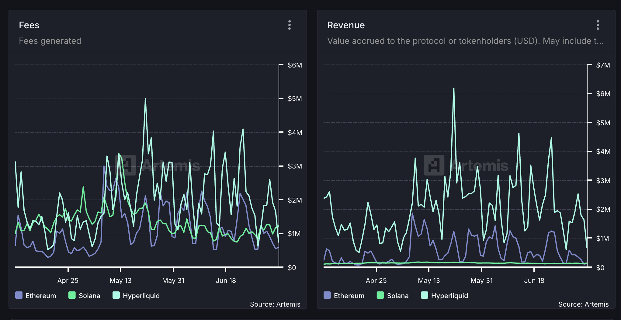 Artemis data reveals that Hyperliquid has come out on top in daily revenue, while Solana has trailed behind over the past three months. Impressively, this lead isn’t just a recent milestone. The protocol has also maintained higher weekly revenue levels since February.