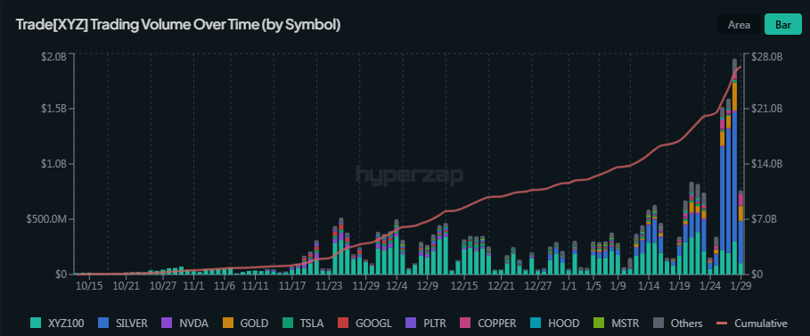 HIP-3 reached peak trading volumes driven by the sudden interest in a new silver-based perpetual futures pair. | Source: HIP-3