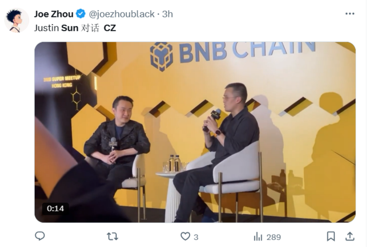 CZ talking with Justin Sun at a BNB event in Hong Kong. Source:X(joezhoublack)