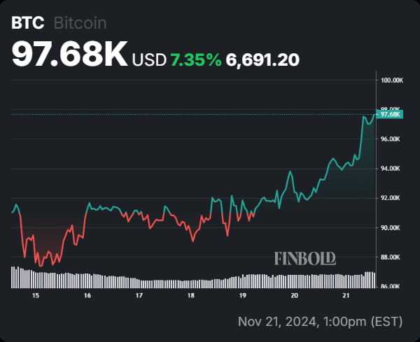 At the time of her remarks, Bitcoin was trading at $56,942 per coin. Fast-forward to today, November 21, Bitcoin had surged to $97,680 by press time, marking an increase of over 71%.