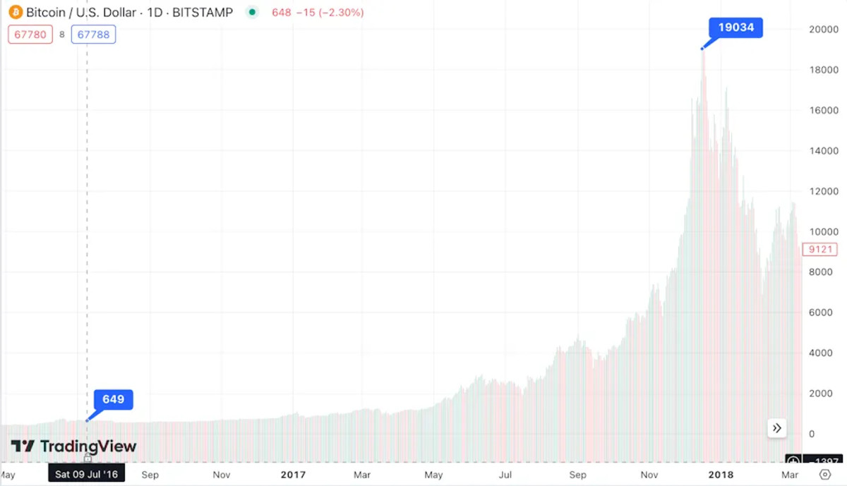 Nevertheless, we are in a very unique situation that can impact the market in unpredictable ways. Bitcoin’s next halving is set to arrive in April, and this will be the first time in its entire history that the halving will coincide with an all-time high for price. Although there have been a great deal of differences between each of the major halvings, a trend has been generally noticeable: even if there are huge steady gains, it is in the ballpark of a year to 18 months before Bitcoin breaks all records with a true price spike. One year out from the halving in June 2016, Bitcoin had more than doubled; yet a few months later, the growth was closer to 30x.