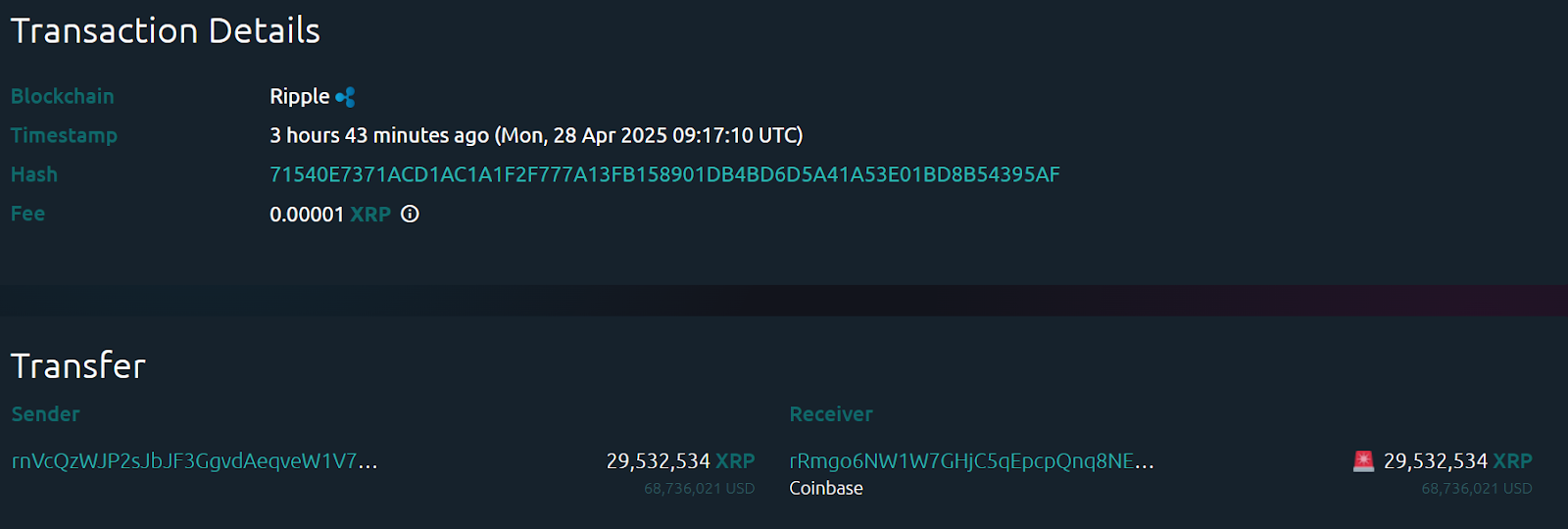 Specifically, on April 28, a massive transfer of 29,532,534 XRP, worth approximately $68.7 million, was moved from an unknown wallet to crypto exchange Coinbase, according to Whale Alert data.