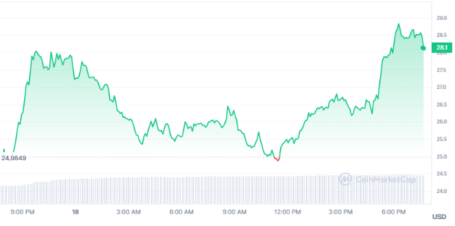 Injective reacted to the collaboration announcement with notable optimism. The altcoin painted its 24-hour chart green after gaining over 15% within the past day to trade at $28.53.