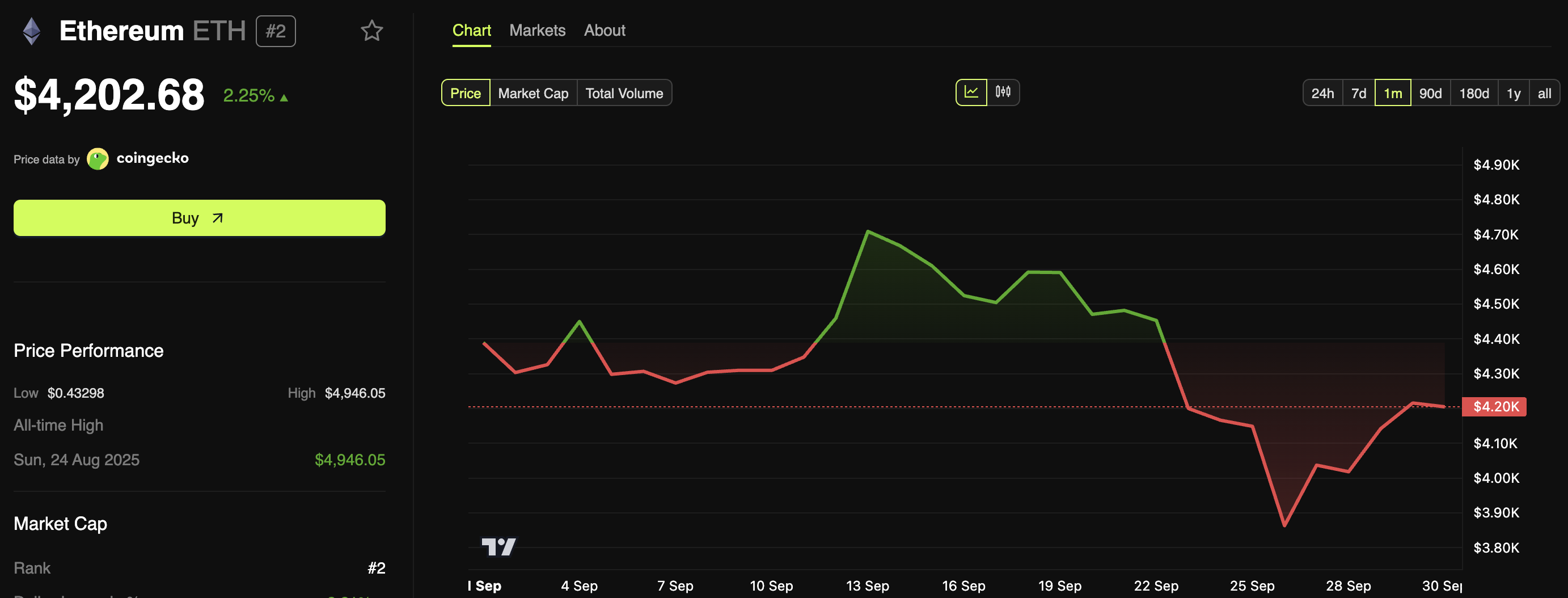 Meanwhile, the institutional bets come as ETH started to rally again following its drop to below $4,000. However, the altcoin managed to reverse the losses and has continued to rise. At press time, it traded at $4,202, up 2.25% over the past day.