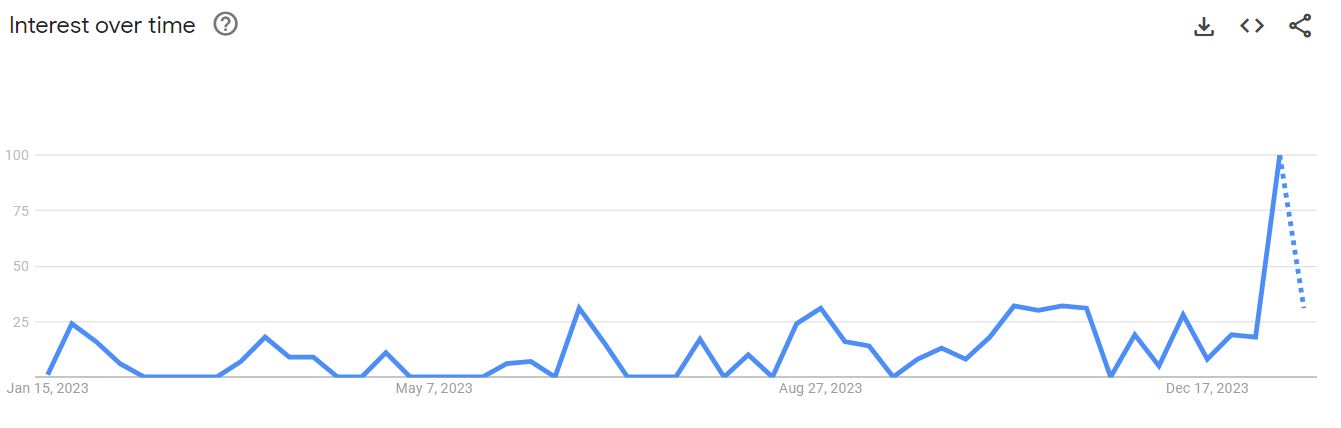 In particular, data acquired by Finbold on January 15 indicates that by the week ending January 13, the interest in the keyword hit a peak popularity score of 100, the highest point over the last month. Notably, between January 6 and January 14, the interest spiked by 455%.
