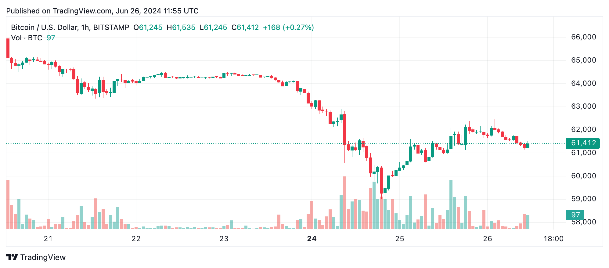 Currently, bitcoin’s price is $61,470, reflecting significant volatility in recent trading sessions. The daily chart shows price action around the recent low of $58,456 resembling a bullish hammer candlestick, which often indicates a potential reversal after a downtrend. The volume spike on the day of this drop suggests a selling climax, indicating the worst of the selling pressure might be over, potentially paving the way for an uptrend.
