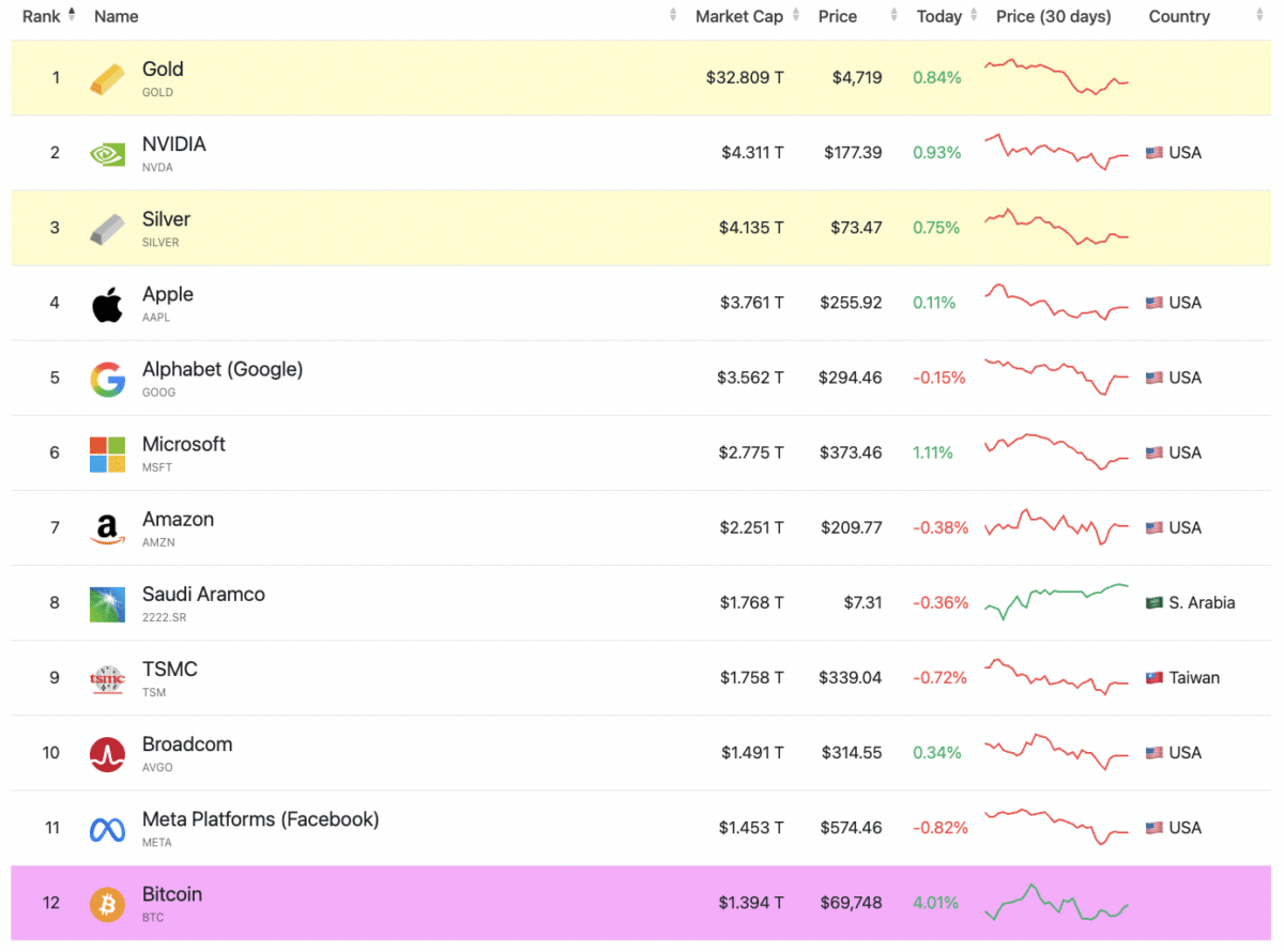 In fact, we look at the top assets by market cap, Gold still ranks at the top, whereas Bitcoin is still struggling at the 12th rank.