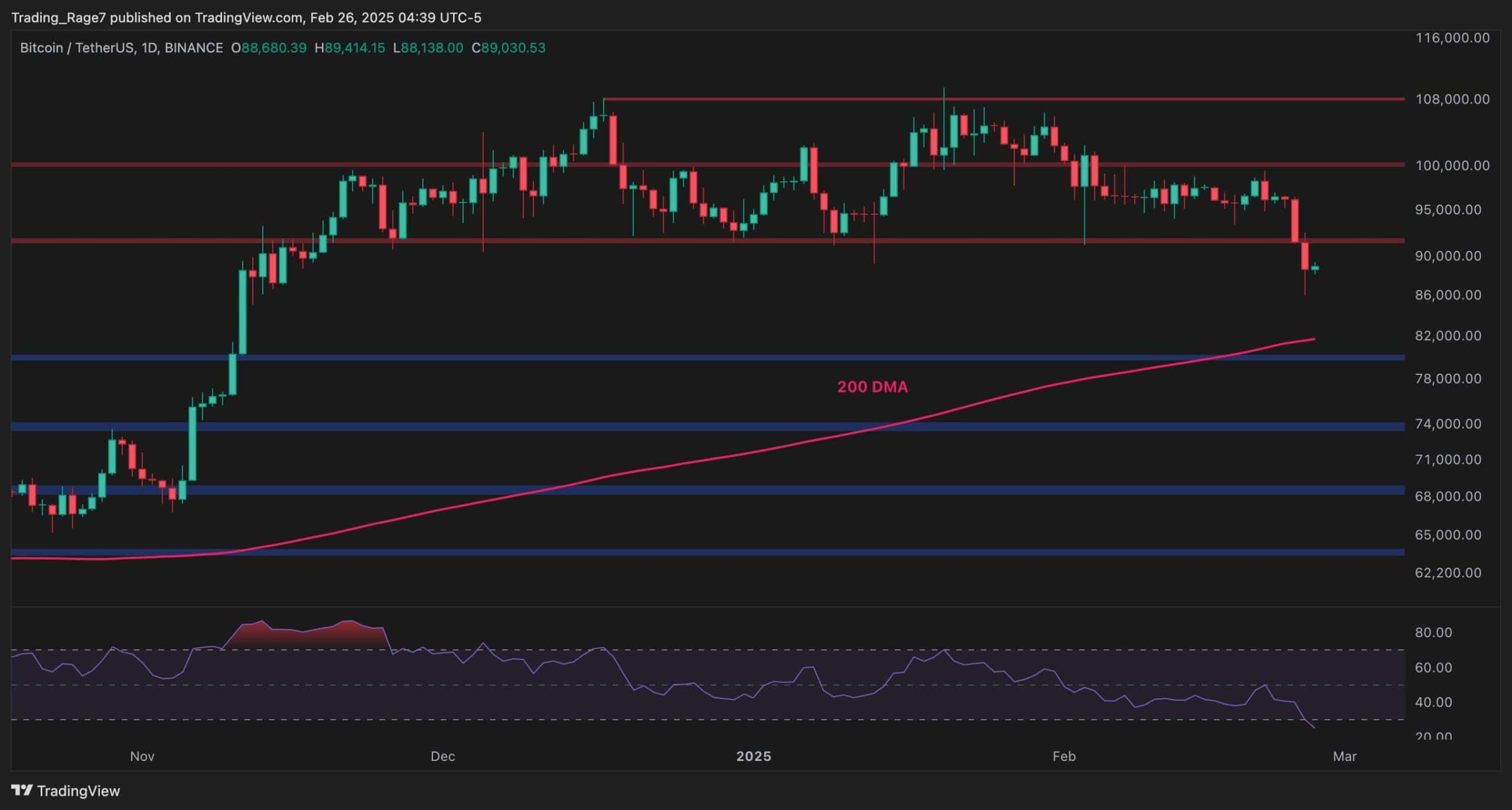 While both the $100K and $92K levels have been lost, the price might still drop lower toward the $80K line in the coming weeks. Yet, with the RSI showing a clear oversold signal, a pullback or consolidation looks likely in the short term.