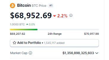 However, that optimism has been tempered by the recent price drop. Bitcoin has plummeted roughly 6% from its peak, effectively erasing the gains made earlier this week. While the price has recovered slightly to hover around $69,200, it remains below the psychological barrier of $70,000.
