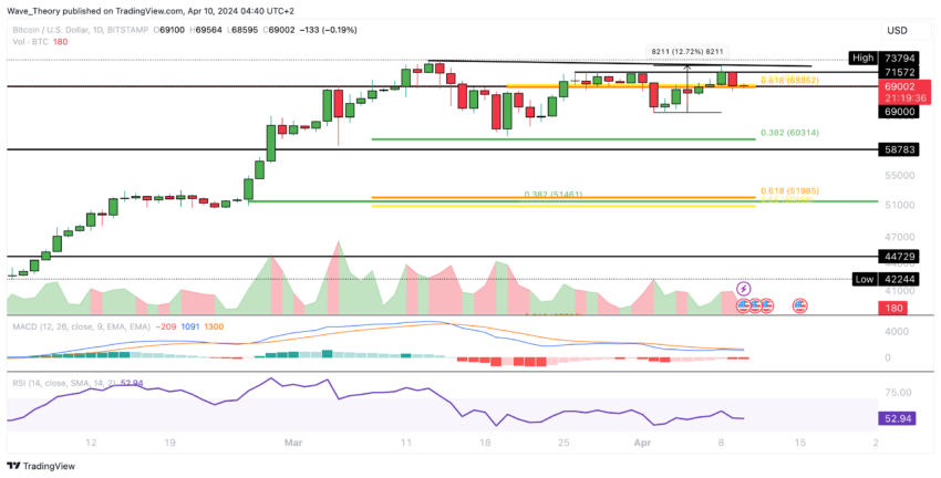 After reaching a local low at approximately $64,500, BTC experienced a significant rally, resulting in a price increase of around 12.7%. However, since yesterday, the BTC price has been retracing again, bringing it back to the golden ratio at around $68,850.