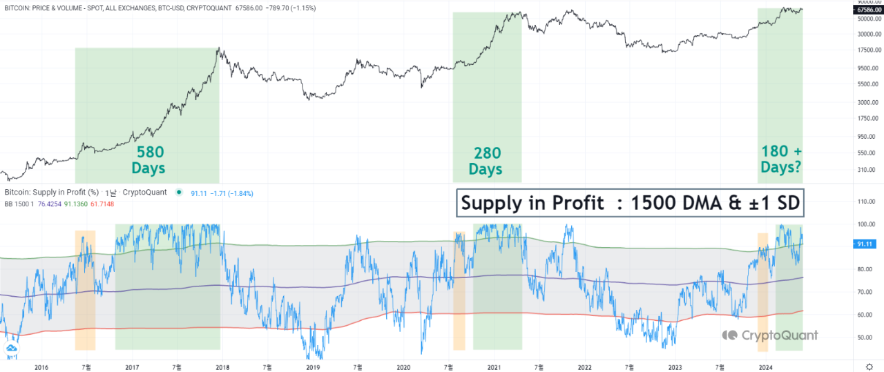 CryptoQuant has introduced a novel approach by incorporating the ultra-long-term moving average (1,500 DMA) with ±1 standard deviation to better understand this metric over Bitcoin’s cycles, which coincide roughly with its four-year halving events. Observations show that when the Supply in Profit exceeds the upper boundary of this range, it consistently aligns with the onset of major bull markets.