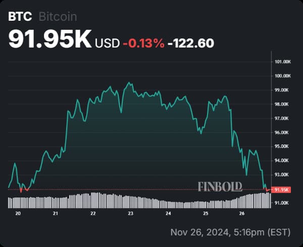 The maiden cryptocurrency has plunged over 5% in the last 24 hours, trading at $91,950 as of press time.