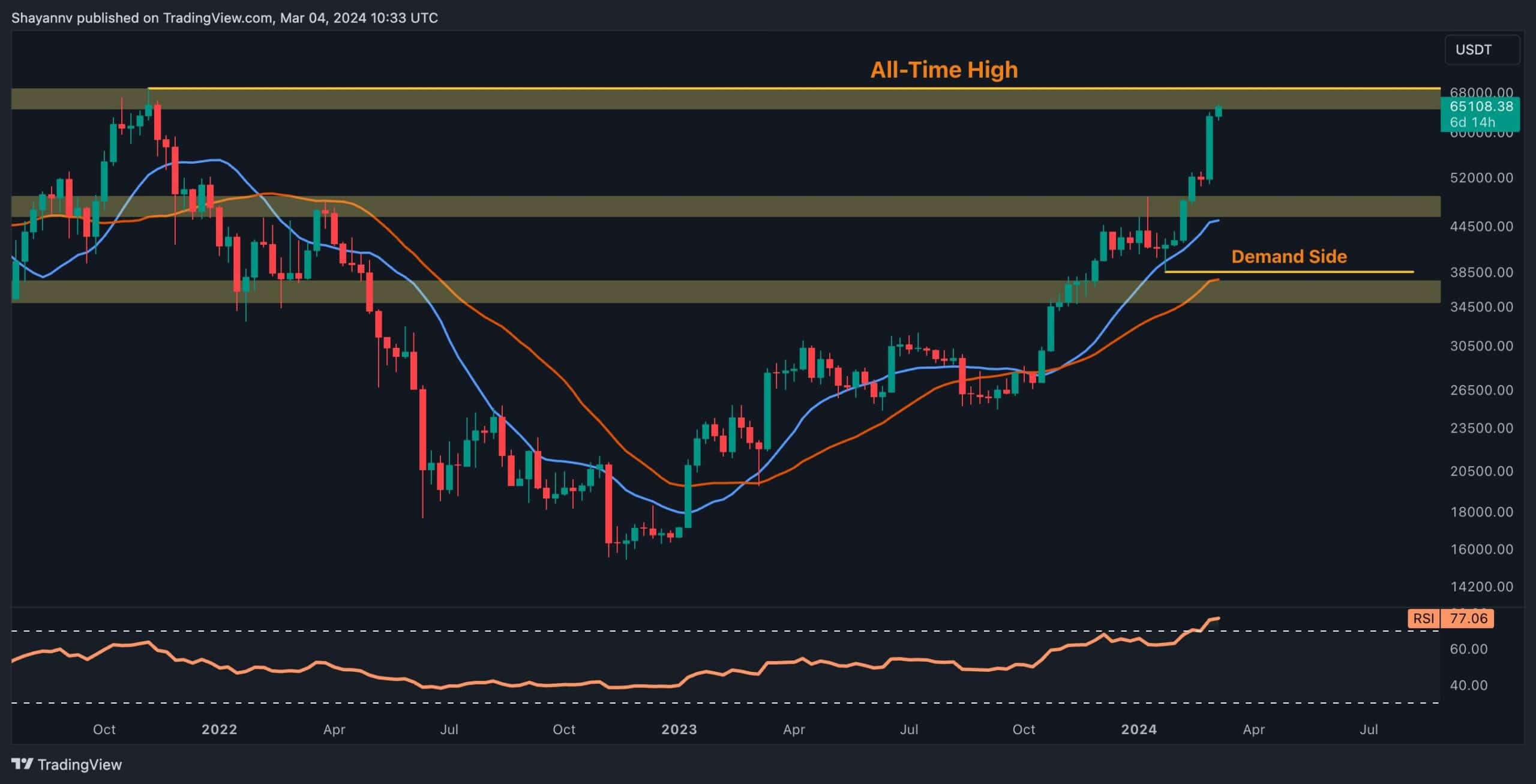 As participants seek to capitalize on profits, heightened selling pressure may emerge, potentially triggering a temporary market reversal. Should a retracement occur, Bitcoin’s primary target on the weekly chart would be the significant support zone around $48K, aligned with the 100-day moving average. Nonetheless, the broader outlook suggests Bitcoin is poised to extend its bullish trajectory, eyeing new all-time highs in 2024.