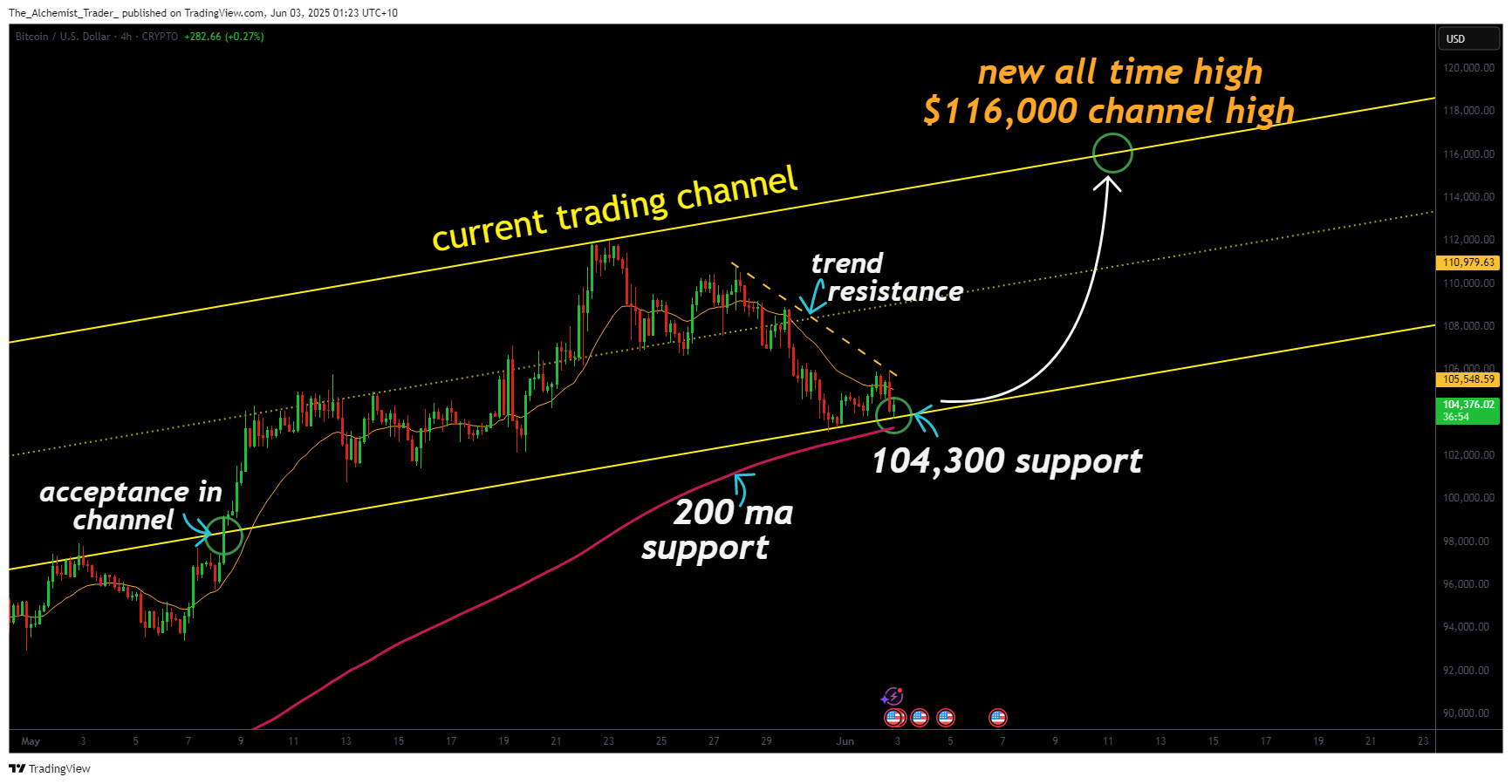 - Channel Low Support at $104,300: Acts as the structural base for the current bullish trend; holding this level is crucial for any continuation to the upside.