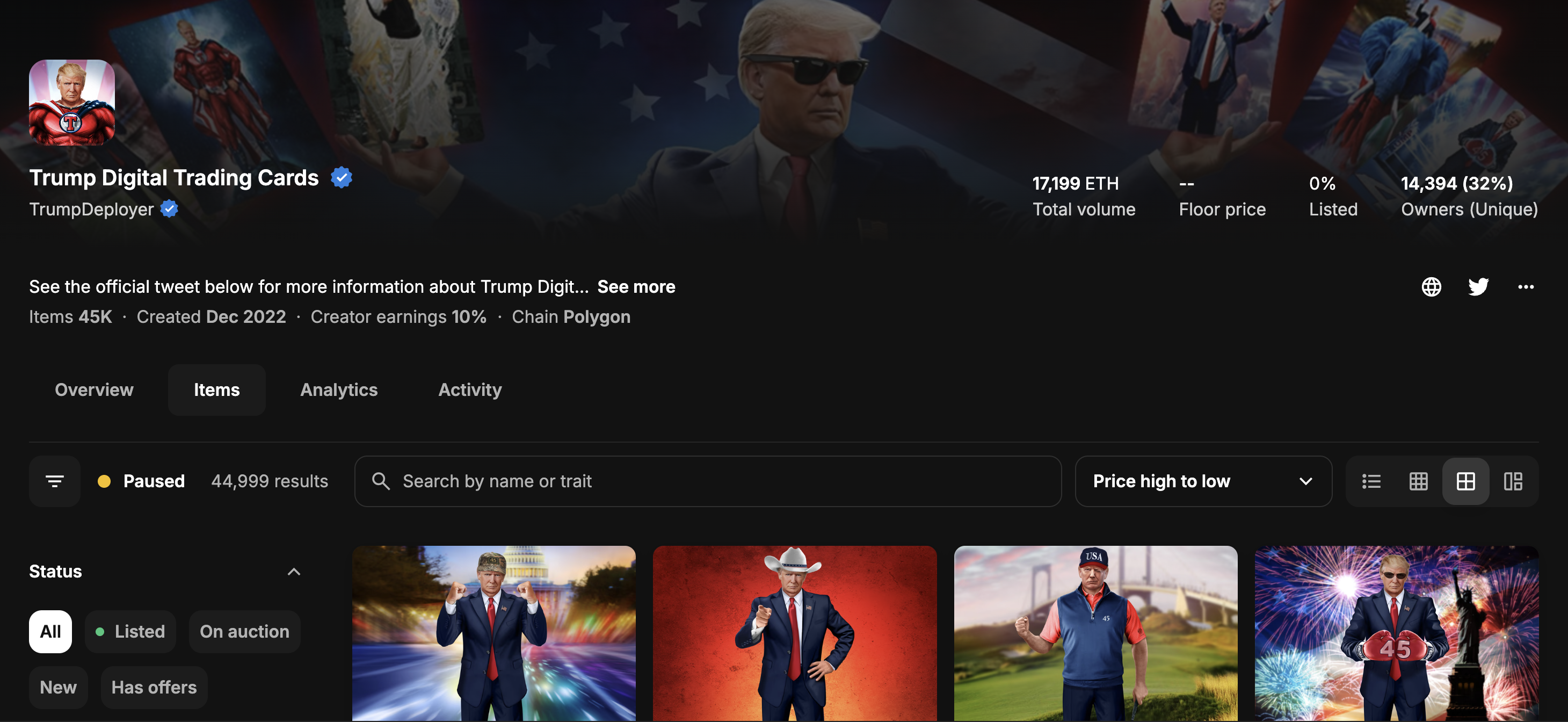 According to OpenSea data, the total trading volume for Trump Digital Trading Cards reached 17,167 ETH, equivalent to tens of millions of USD—an impressive figure for an NFT collection.